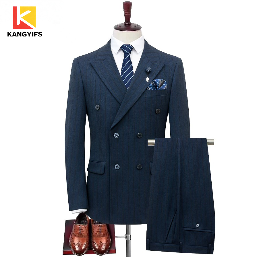 طقم بدلة عمل مزدوجة الصدر مخططة باللون الأزرق الداكن للرجال من KANGYIFS ينضح بأسلوب مهذب
